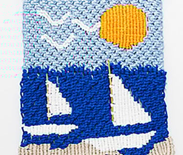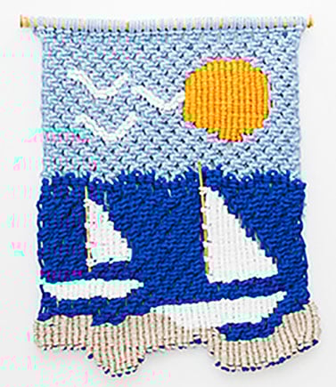 Llamativo tapiz que evoca el verano con un sol radiante y los veleros haciéndose a la mar desde la playa. Mástiles en auténtica caña. Acabado irregular que incrementa el realismo de la escena. Dim. 63-69 x 84 cm.